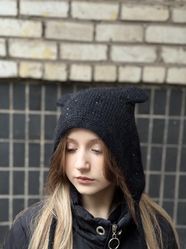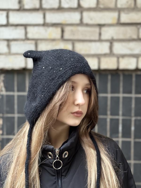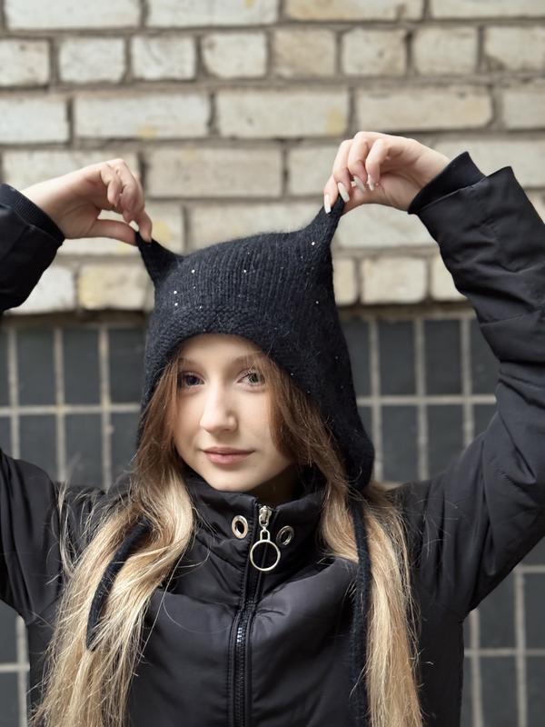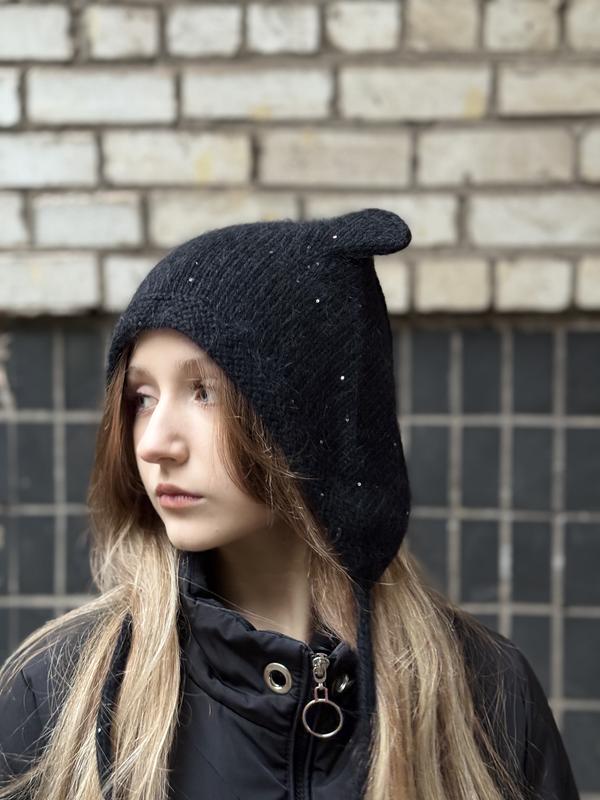 Модний в’язаний кото чепчик з пухнастої ангори з мікро паєтками — м’який, теплий й приємний на дотик. Має милі «вушка» та зав’язки, які можна залишити вільно або зав’язати.