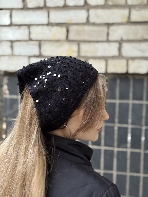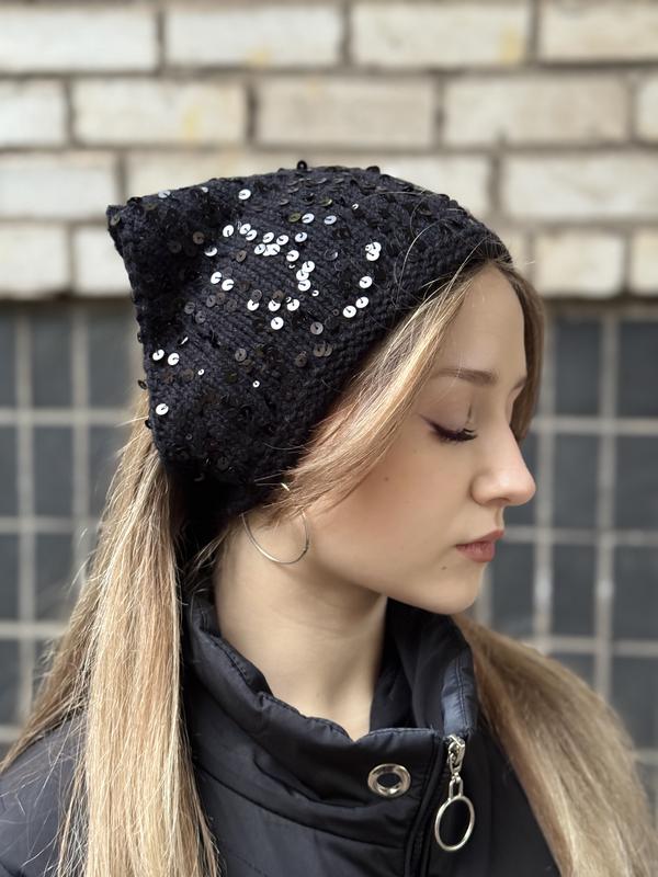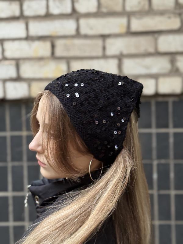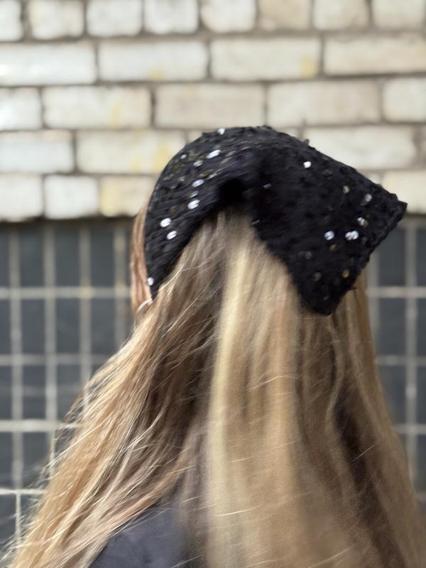 Стильна трендова вязана хустка бандана з паєтками. Тепла зимова повʼязка косинка на голову ручної роботи.