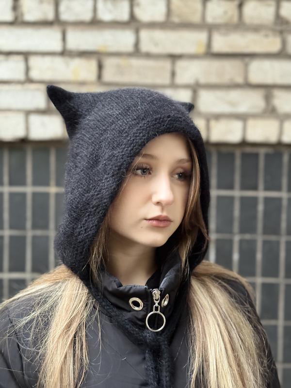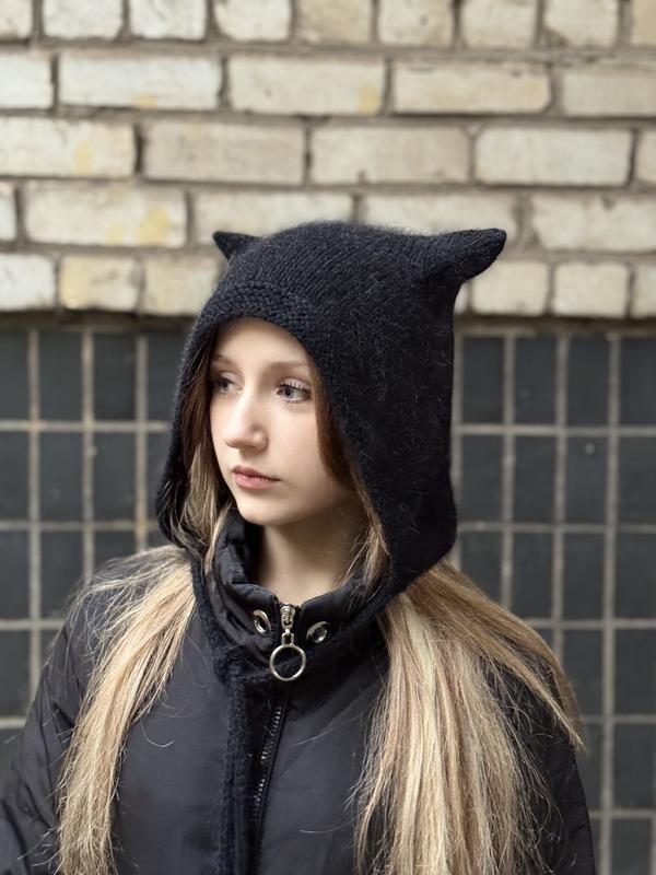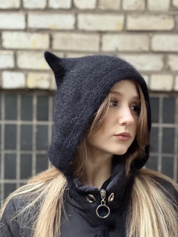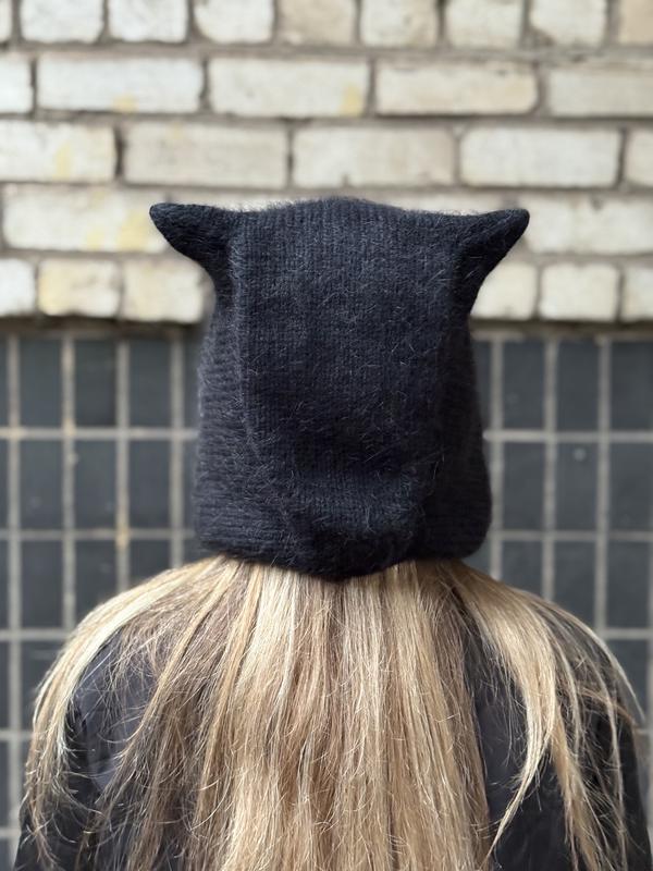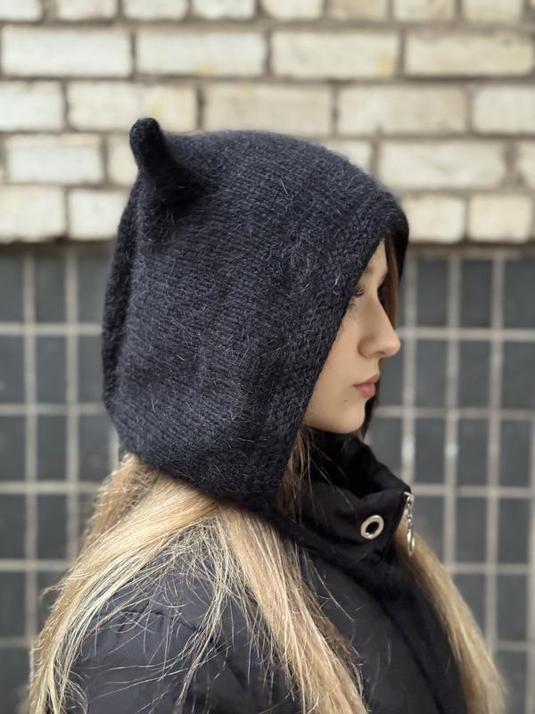 Стильна в’язана кото шапка з пухнастої ангори — м’яка, тепла й приємна на дотик. Має милі «вушка» та довгі зав’язки (~72см), які можна залишити вільно або зав’язати бантом.
